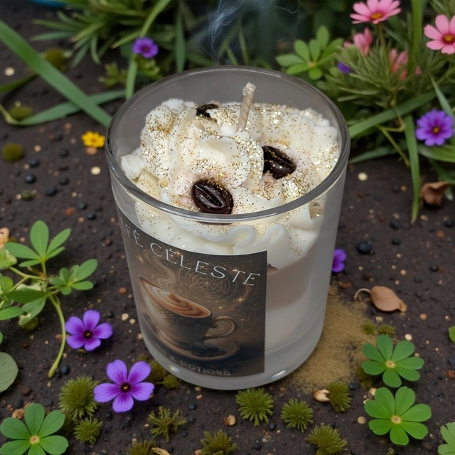 Plongez dans une pause hors du temps avec Café Céleste, une bougie gourmande inspirée des cafés enchantés nichés entre ciel et nuages.