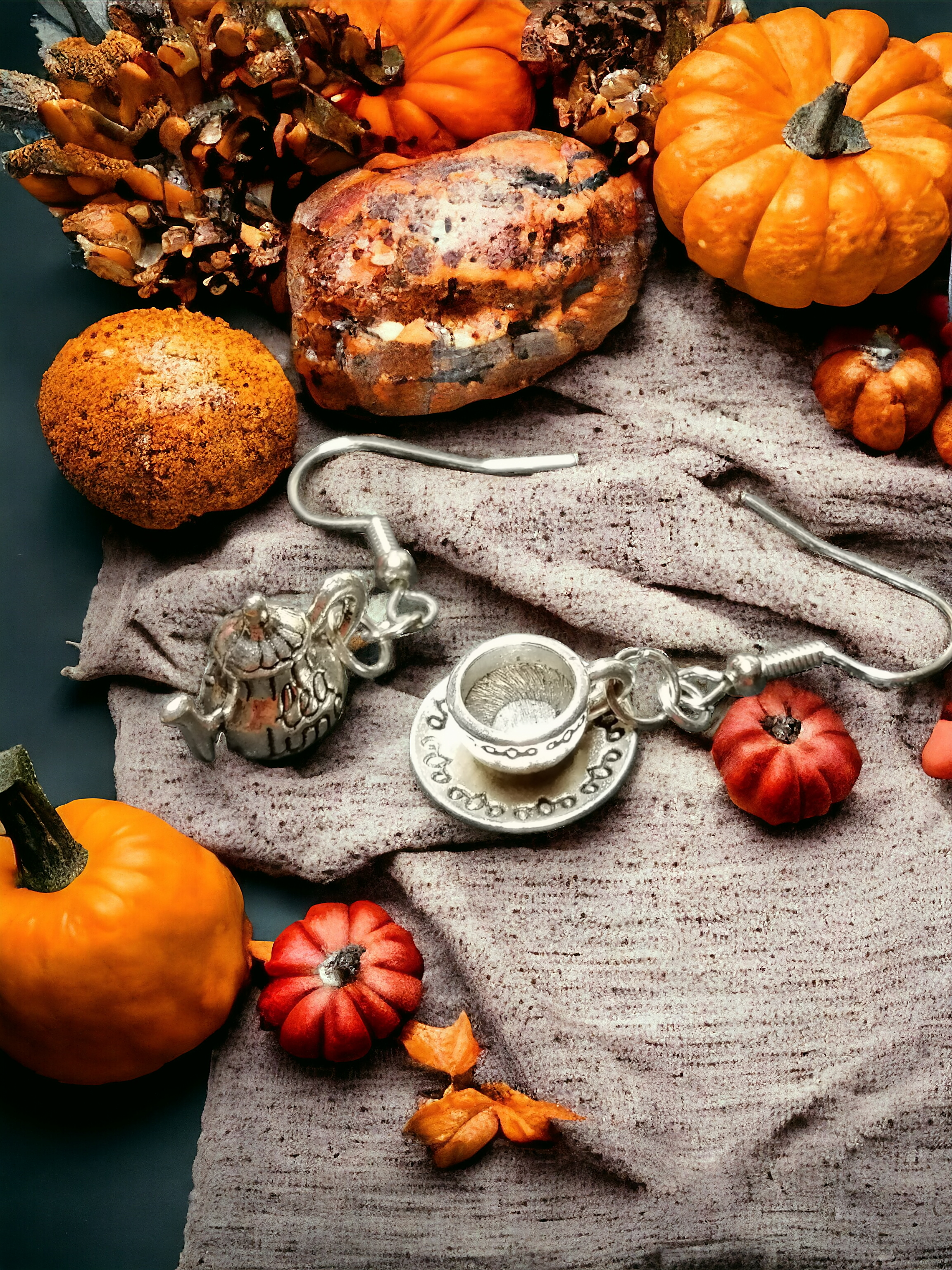 Paires de boucles d’oreilles dépareillées avec pendentif en métal en forme de tasse et de théière.