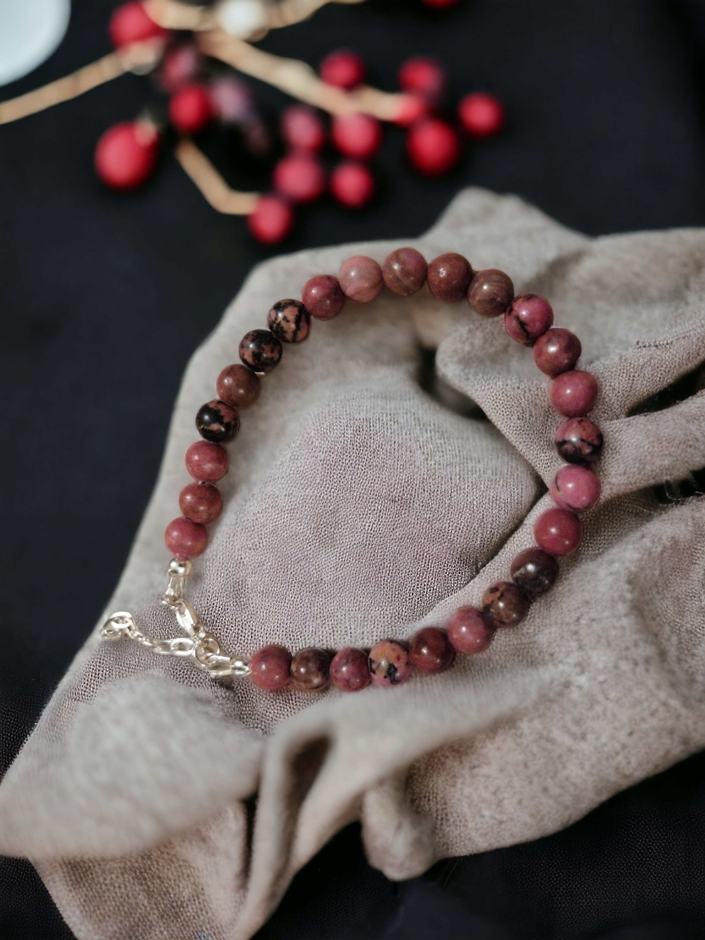 Bracelet composé de 26 perles de pierres naturelles de Rhodonite de 6mm environ, montées sur un fil câblé en Argent 925 et muni d’une chaînette d’extension.