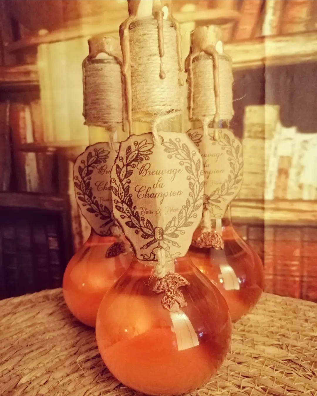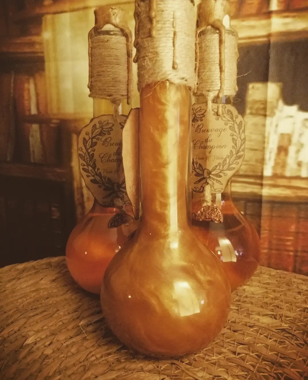 « Donne Force et Vigueur à celui qui consomme la Potion, la fiole de ce breuvage du champion est idéal pour les combattants (ou les conflits entre voisins…). Durée d’action : 4h »